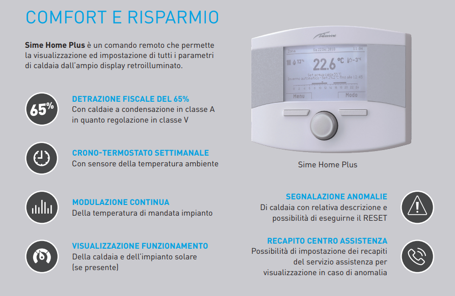 Il prodotto raggiunge i requisiti necessari ai fini della detrazione fiscale del 110%. Per la detrazione del 65% si rende necessario l’abbinamento ad un comando remoto o sonda Sime Smart